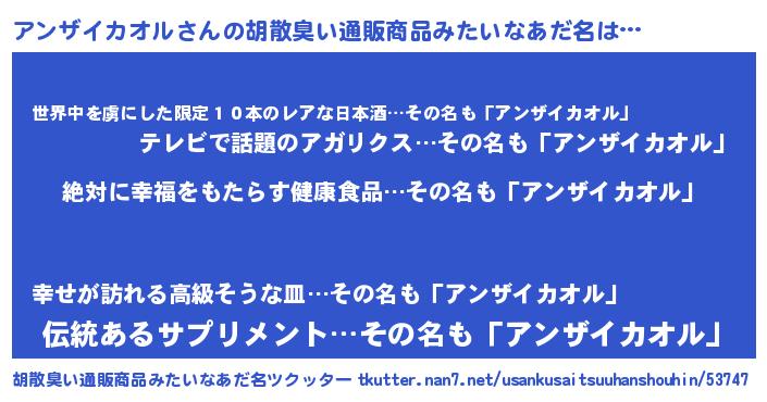 | 意味不明あだ名 | 『永久保存アンザイカオル』 |
