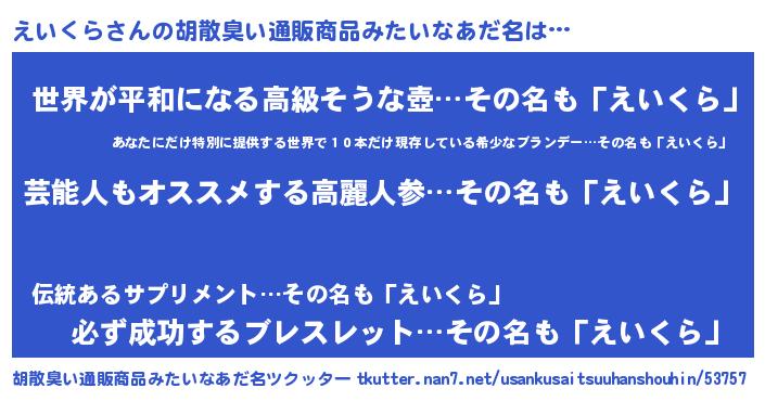 | 男性向けラノベタイトル風あだ名 | 『えいくら~年齢イコール彼女いない歴の魔法使い~』 |