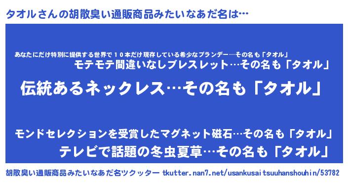 | 意味不明あだ名 | 『とにかく怪しいタオル』『自称タオル』 |