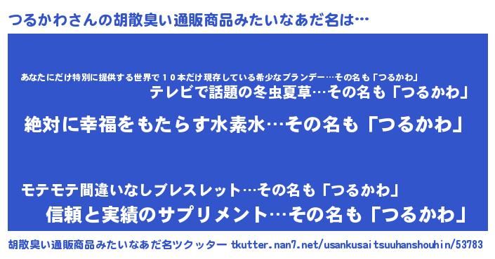 | 男性向けラノベタイトル風あだ名 | 『緋弾のツルカワ』『魔弾の王とつるかわ』 |