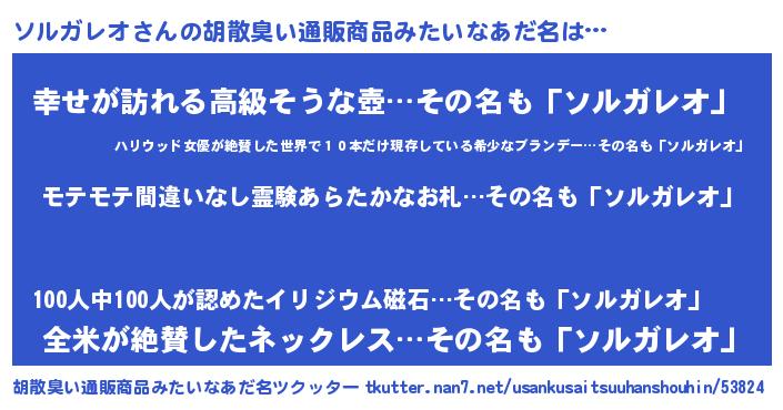 | 男性向けラノベタイトル風あだ名 | 『ソルガレオの憂鬱』 |