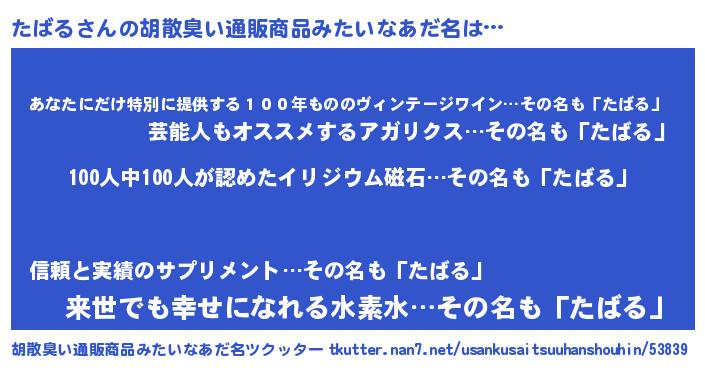 | 女子向けラノベタイトル風あだ名 | 『たばる夫妻のなれそめ』『闇のたばる』 |