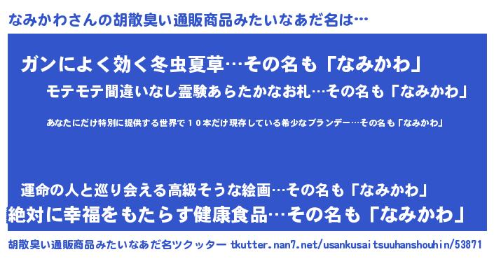 | ヒーロー風カッコイイあだ名 | 『仮面ナミダー』『ウルトラ戦士ナミカワ』 |