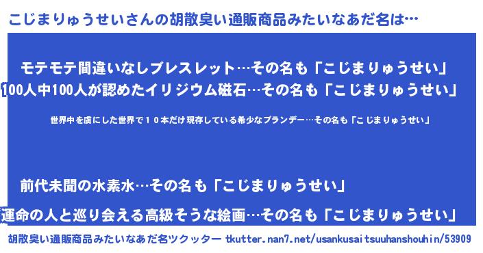 | 意味不明あだ名 | 『住所不定無職こじまりゅうせい(98歳)』 |