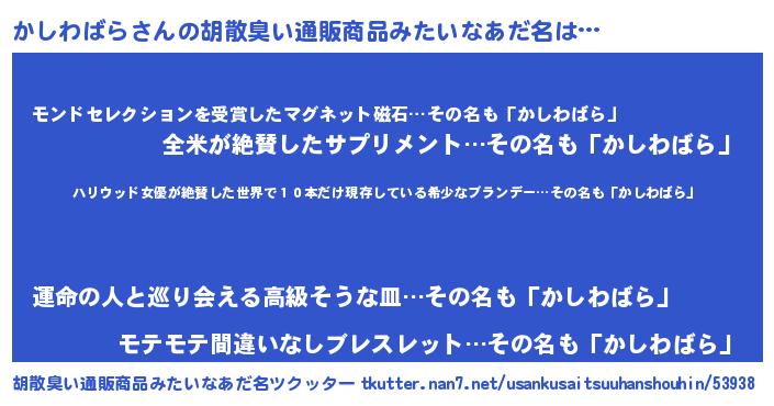 | 意味不明あだ名 | 『住所不定無職かしわばら(95歳)』 |