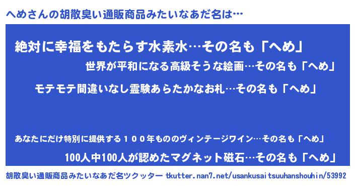 | ヘコむあだ名 | 『へめもー』『へめ(遠い目)』『豆乳』 |