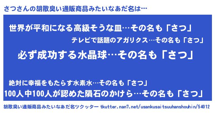 | ヘコむあだ名 | 『さつにゅー』『豆乳』『さつっ子』 |