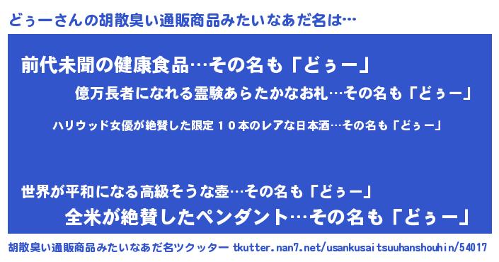 | 意味不明あだ名 | 『住所不定無職どぅー(62歳)』 |