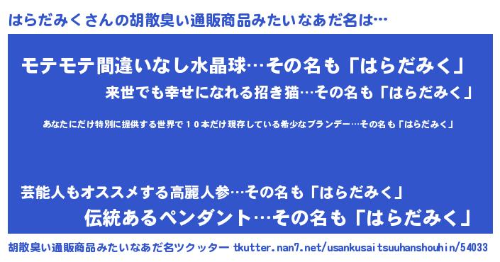 | 男性向けラノベタイトル風あだ名 | 『はらだみくに滅ぼされるだけの簡単なお仕事です』 |