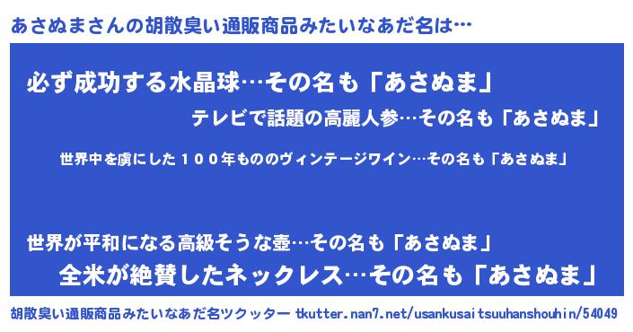 | 意味不明あだ名 | 『住所不定無職あさぬま(12歳)』 |