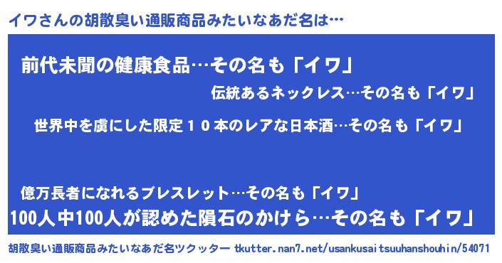 | 意味不明あだ名 | 『住所不定無職イワ(40歳)』『永久保存イワ』 |