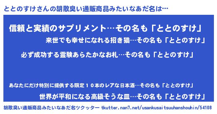 | 男性向けラノベタイトル風あだ名 | 『ととのすけの憂鬱』 |