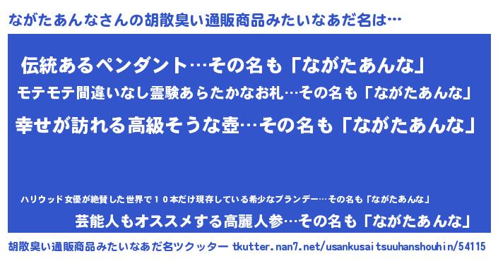 | 男性向けラノベタイトル風あだ名 | 『やはりながたあんなの青春ラブコメはまちがっている 』 |