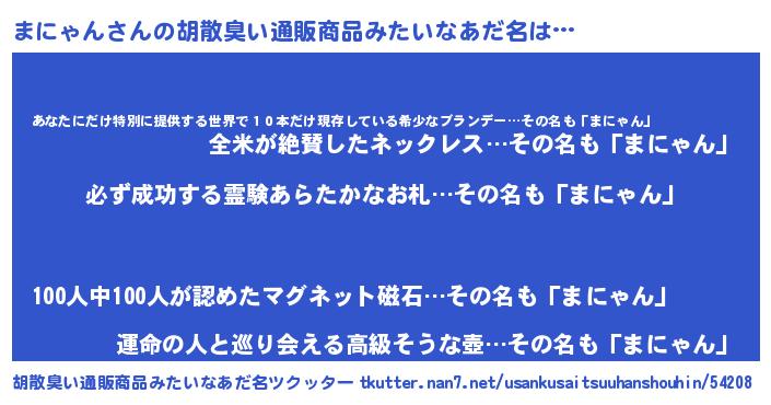 | 男性向けラノベタイトル風あだ名 | 『まにゃんの憂鬱』『マニャンスレイヤー』 |