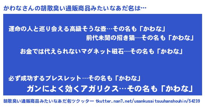 | ヘコむあだ名 | 『なまこ酢』『かわな(笑)』 |