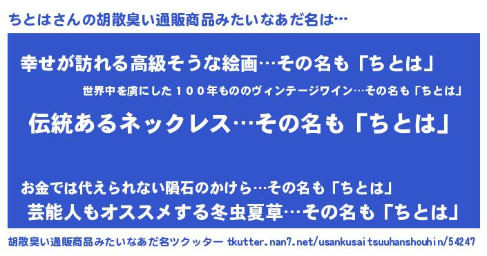 | 女子向けラノベタイトル風あだ名 | 『ちとはの卵を拾いまして』『闇のちとは』 |