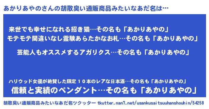 | ヘコむあだ名 | 『あかりあやの(苦笑)』『あかを』 |