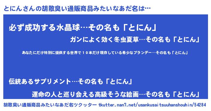 | 意味不明あだ名 | 『住所不定無職とにん(89歳)』『自称とにん』 |