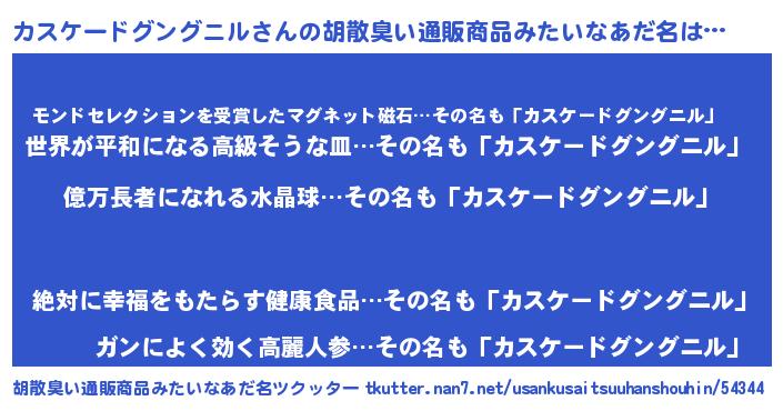 | 男性向けラノベタイトル風あだ名 | 『カスケードグングニルアートオンライン』 |