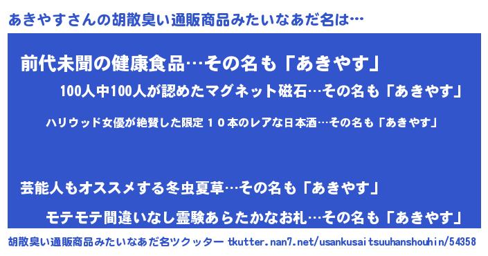 | 意味不明あだ名 | 『住所不定無職あきやす(43歳)』 |