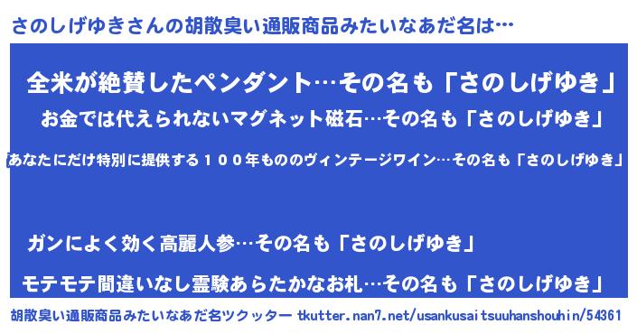 | 意味不明あだ名 | 『住所不定無職さのしげゆき(8歳)』 |