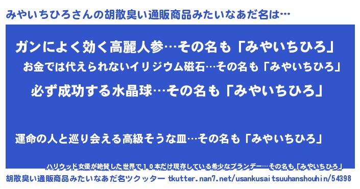 | 恥ずかしいあだ名 | 『プリティーみやいちひろ』『みやっちょ』 |