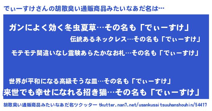 | 意味不明あだ名 | 『ペロリンでぃーすけ』『自称でぃーすけ』 |