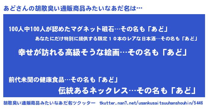 | 女子向けラノベタイトル風あだ名 | 『あどの雑貨屋さん』『死神あどの再婚』 |