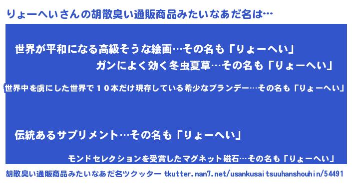 | 意味不明あだ名 | 『住所不定無職りょーへい(89歳)』 |