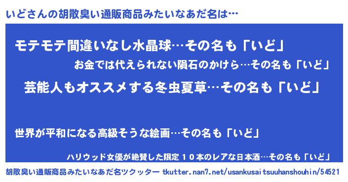 | ヘコむあだ名 | 『いどもー』『なまこ酢』『いどっぺ』 |