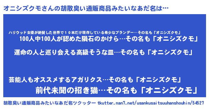 | 男性向けラノベタイトル風あだ名 | 『オニシズクモ~年齢イコール彼女いない歴の魔法使い~』 |