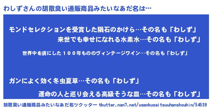 | 意味不明あだ名 | 『もやし科わしず属』『永久保存わしず』 |