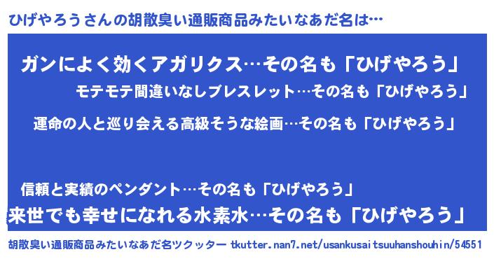 | 男性向けラノベタイトル風あだ名 | 『ひげやろう~年齢イコール彼女いない歴の魔法使い~』 |