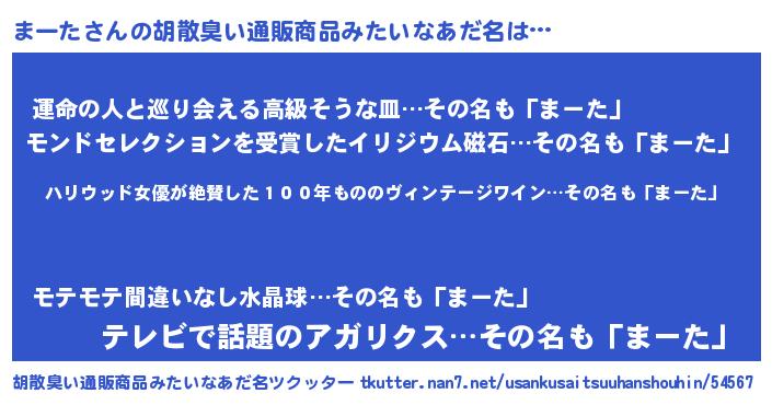 | 意味不明あだ名 | 『住所不定無職まーた(12歳)』『自称まーた』 |