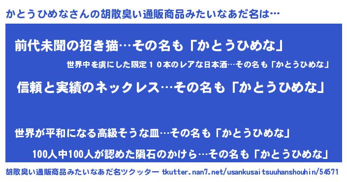 | ヘコむあだ名 | 『かとっ子』『かとうひめな(笑)』 |