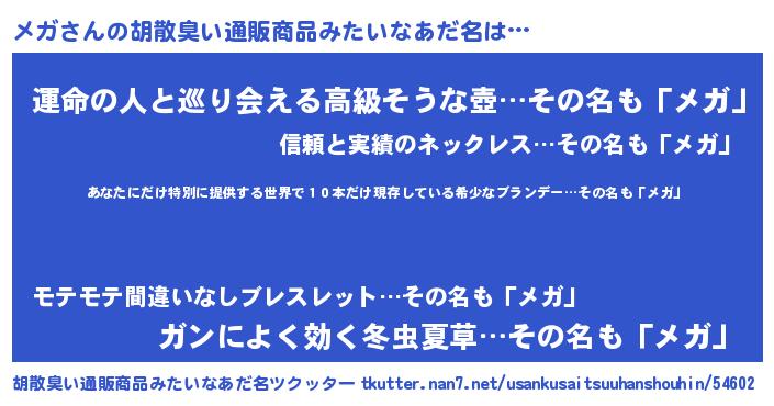 | 意味不明あだ名 | 『住所不定無職メガ(77歳)』『自称メガ』 |