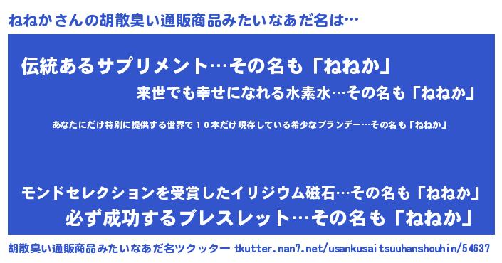 | 男性向けラノベタイトル風あだ名 | 『この素晴らしい世界にねねかを!』 |