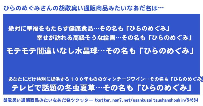 | ヘコむあだ名 | 『ひらもー』『ひらのめぐみ(爆)』 |