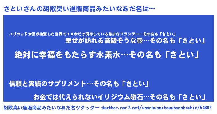| 男性向けラノベタイトル風あだ名 | 『さといという概念が存在しない退屈な世界 』 |