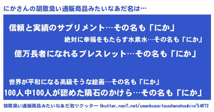 | ポケモン風あだ名 | 『ニカゴンZ』『ニカチュウ』『ヒニカ』 |