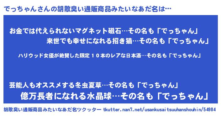 | 意味不明あだ名 | 『住所不定無職でっちゃん(53歳)』 |