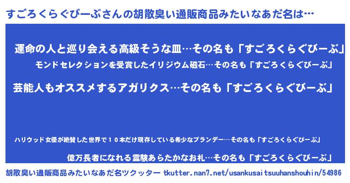| 男性向けラノベタイトル風あだ名 | 『すごろくらぐびーぶ~年齢イコール彼女いない歴の魔法使い~』 |