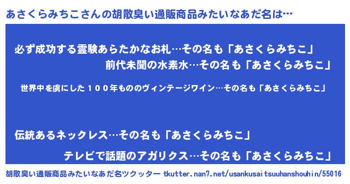 | ヘコむあだ名 | 『あさふぇ~』『あさくらみちこ(震え声)』 |