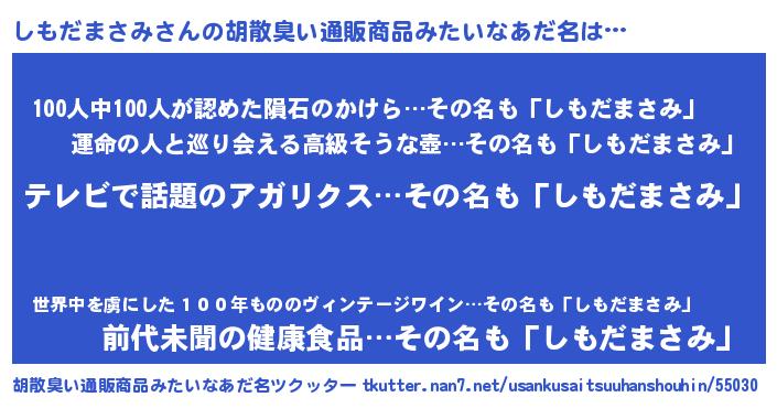 | 男性向けラノベタイトル風あだ名 | 『Re:しもだまさみから始める異世界生活』 |
