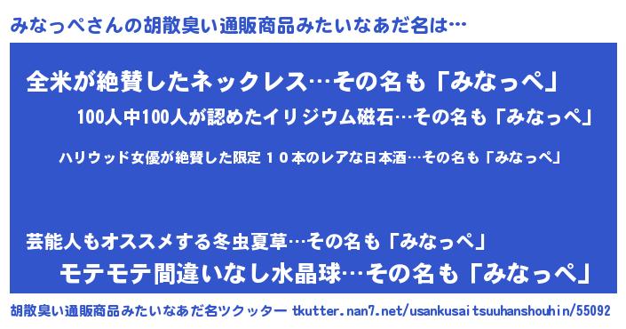 | 意味不明あだ名 | 『住所不定無職みなっぺ(68歳)』 |