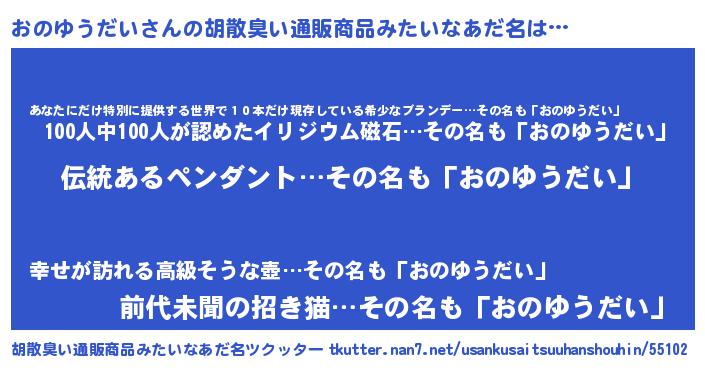 | 男性向けラノベタイトル風あだ名 | 『ダンジョンにおのゆうだいを求めるのは間違っているだろうか』 |