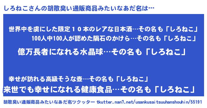 | ヘコむあだ名 | 『しろにゅー』『しろねこ(爆)』 |