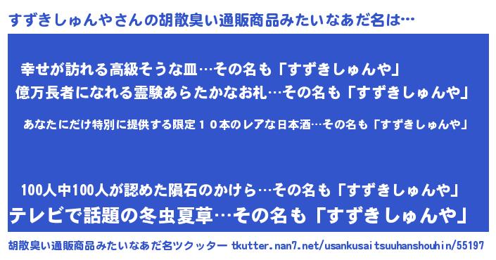 | 意味不明あだ名 | 『住所不定無職すずきしゅんや(53歳)』 |