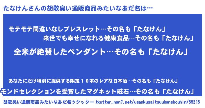 | 男性向けラノベタイトル風あだ名 | 『たなけんの嫁は女の子じゃないと思った?』 |