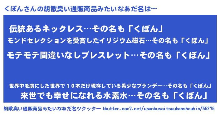 | 男性向けラノベタイトル風あだ名 | 『くぼんの憂鬱』 |